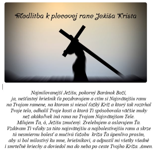 „Mal som ho na mojom pleci, keď som niesol kríž. Obrovská rana, ktorá spôsobovala väčšiu bolesť ako všetky ostatné a nikde nie je pre človeka zjavená. Uctievaj si túto ranu a obdarím Ťa o čo cez jej zásluhy a milosť budeš žiadať. A pre tých, čo si ju budú uctievať odpustím im ich ľahké hriechy a nespomeniem si na ich hriechy smrteľné.“
