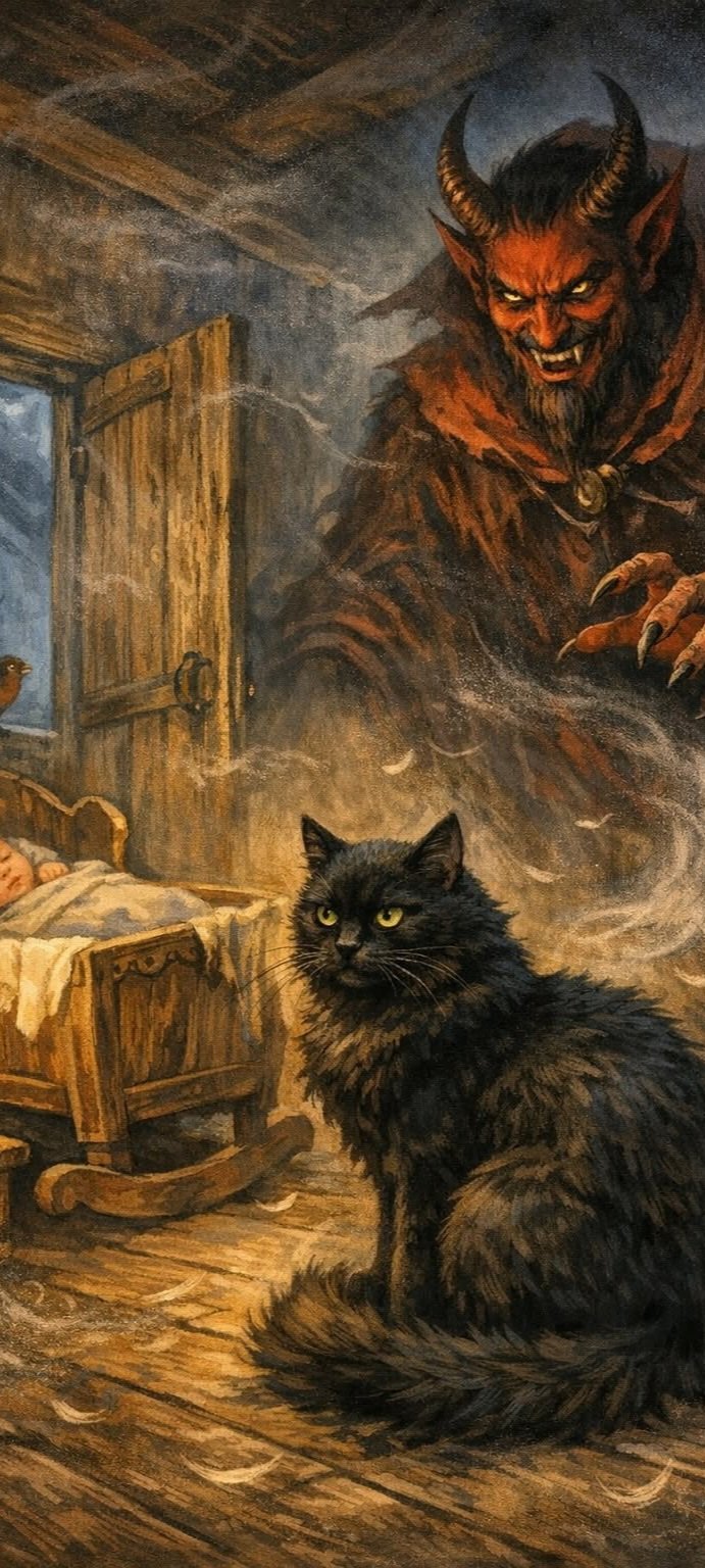 Po chvíli sa v dome objavil diabol a keď ho mačka uvidela, skočila pred detskú kolísku bez strachu, pretože je dobre známe, že mačky sú jediné zvieratá, ktoré sa tejto zlej bytosti neboja.
