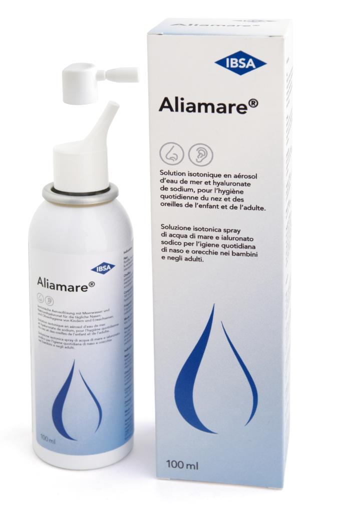 Sprej Aliamare® je 100% čistý prírodný produkt bežne dostupný v lekárni bez receptu v baleniach 50 a 100 ml. Obsahuje 2 samostatné nástavce, vďaka čomu ho je možné použiť na hygienu nosa aj ucha. Obal spreja je špeciálny, zabraňuje nasávaniu vzduchu a baktérií z vonkajšieho prostredia, takže voda v ňom sa nekontaminuje a je možné ho použiť až do konca exspirácie uvedenej na obale.