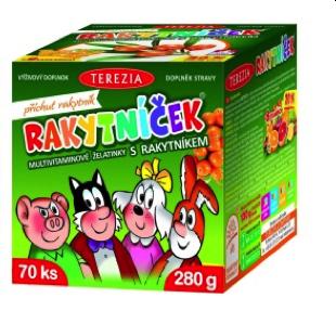 Multivitamínové želatínky RAKYTNÍČEK obsahujú sušenú rakytníkovú šťavu, účinnú látku z rakytníka, ktorý podporuje prirodzenú obranyschopnosť organizmu a metabolizmus, znižuje únavu, prispieva k správnej činnosti zažívacieho traktu a udržuje zdravú pokožku. Vďaka vitamínu C pomáha pri únave a vyčerpanosti. Želatínky RAKYTNÍČEK sú unikátne nielen výbornou ovocnou chuťou, obsahujú 15 – 20 % ovocnej šťavy, ale aj 9 vitamínmi. Obsahujú celý rad zdraviu prospešných látok v prirodzenej a ľahko stráviteľnej forme. RAKYTNÍČEK želatínky neobsahujú konzervačné látky, pridané farbivá ani sladidlá. Dostupné sú s príchuťami rakytník, hruška alebo višňa. Určené deťom od 3 rokov. Doplnok stravy je dostupný v lekárňach.
