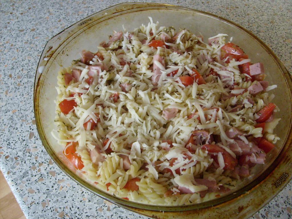 @svuniecko Uvarené vretienka zmiešame s údeným rolovaným plieckom na kocky, paradajkami, posypeme provensálskym korením, premiešame, zalejeme zmesou smotana+mlieko+rozšľahané vajcia, vrch môžme posypať nastrúhaným syrom a zapečieme na 200 cca 45minút