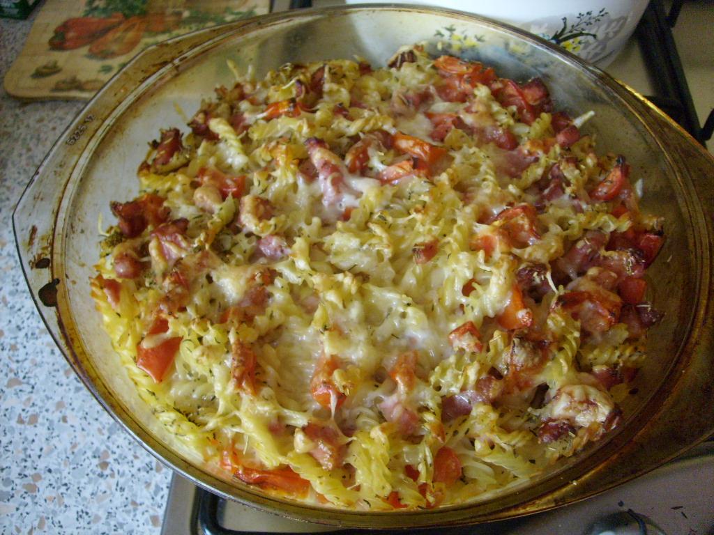 Uvarené vretienka zmiešame s údeným rolovaným plieckom na kocky, paradajkami, posypeme provensálskym korením, premiešame, zalejeme zmesou smotana+mlieko+rozšľahané vajcia, vrch môžme posypať nastrúhaným syrom a zapečieme na 200 cca 45minút