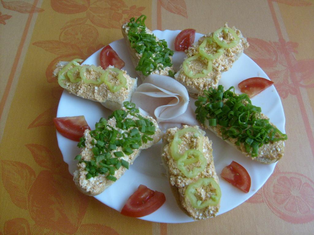 #tvarohova pomazánka : tvaroh 250g, maslo 125g, 1-2kocky (3-4 trojuholníky) taveného syra, soľ, červená mletá paprika, prípadne trošku vegety, všetko spolu zmixovať. Pridať nadrobno nakrájanú cibuľu -1/2-1ks podľa chuti. Len zľahka vmiešať do hotovej pomazánky