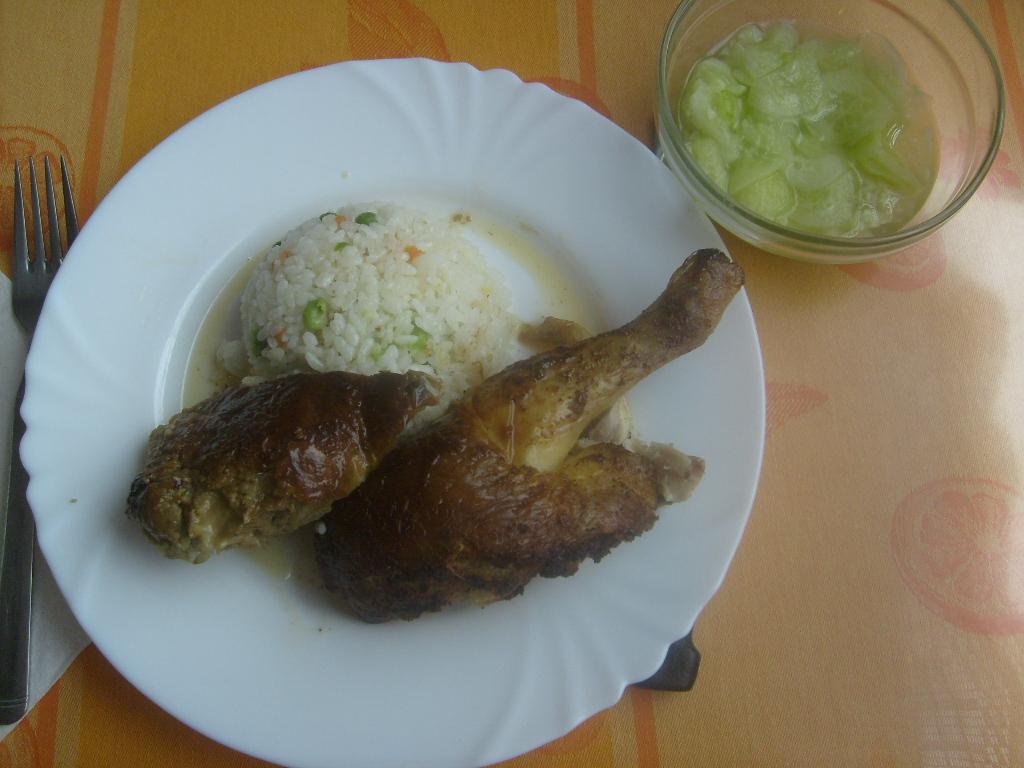 pečené kuriatko s plnkou, ryža, uhorkový šalát