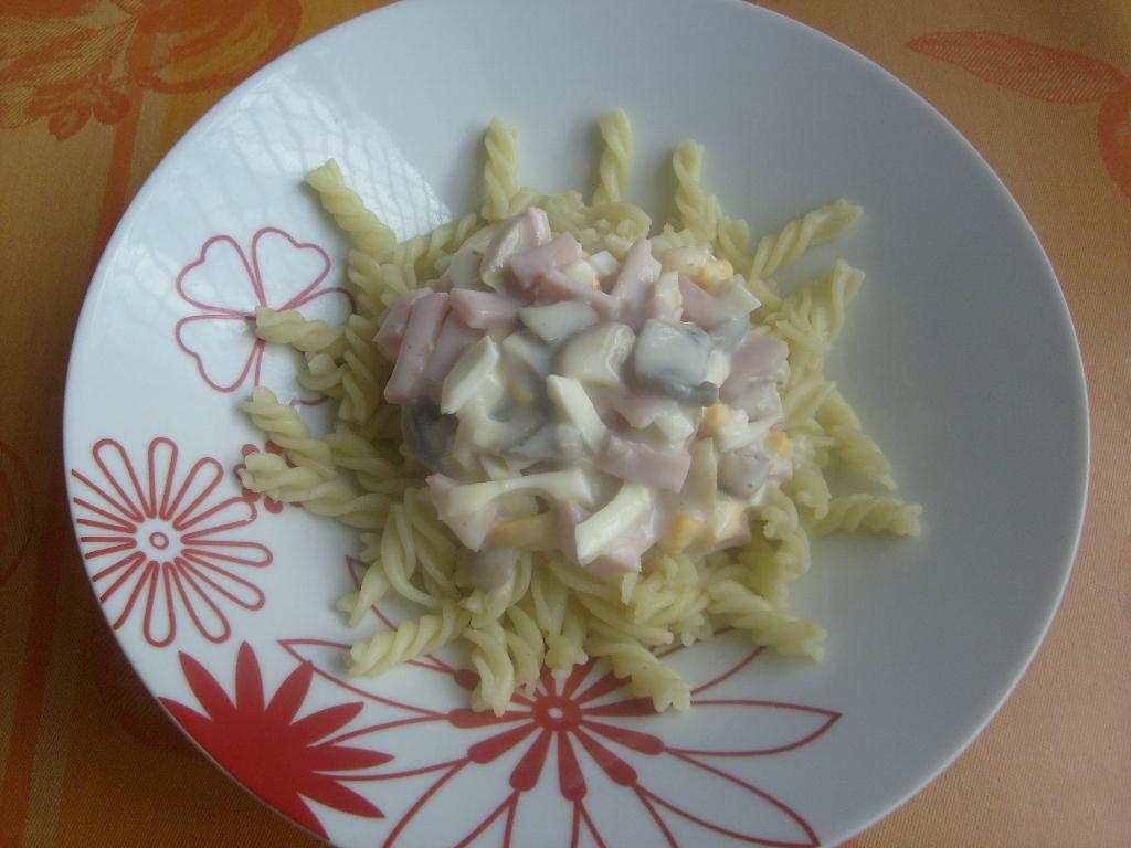 omáčka : na masle speníme 1 malú cibuľku, pridáme 1 konzervu krájaných šampiónov, trochu vegety, rasce a podusíme do mäkka (v tlakovom hrnci 15minút). Zahustíme zmesou : 1 smotana na varenie (12%) + 3-4dcl mlieka + 2-3 PL hladkej múky. Ak treba dosolíme. Do odstavenej omáčky pridáme nakrajánú šunku na malé kocky a uvarené vajcia natvrdo na malé kúsky. Všetko premiešame. Je to rýchle, sýtne a mňam🙂