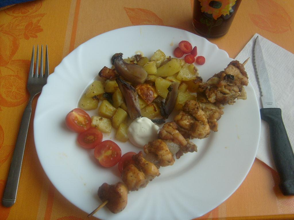 špízy z kuracieho mäsa, slaniny, šampiónov, fialovej cibule, pečené zemiaky