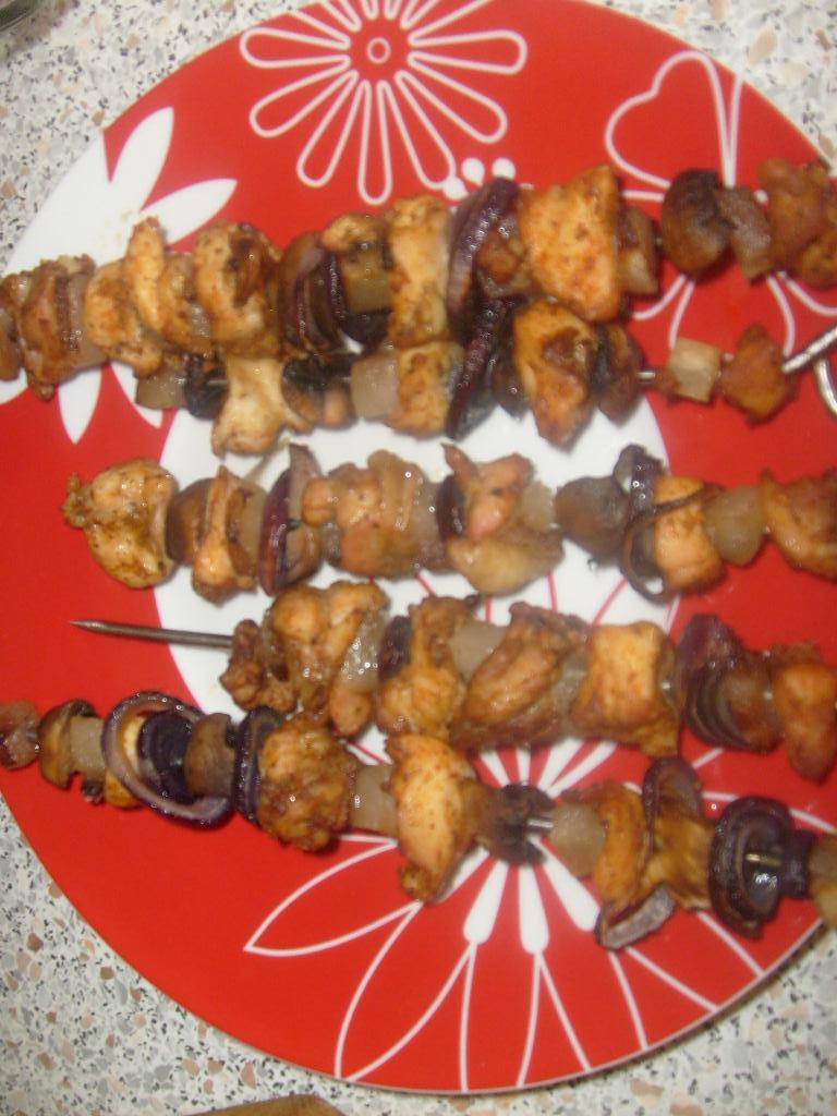 špízy z kuracieho mäsa, slaniny, šampiónov, fialovej cibule,