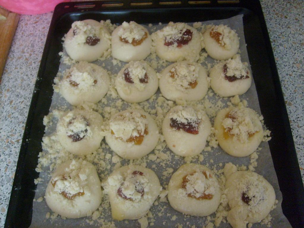 autorklasické kysnuté cesto : 1/2 kocky čerstvé droždie,2KL kryštálový cukor, voda - urobíme kvások, pridáme 500g hladká múka, 2,5dlc teplého mlieka, 1KL soli, trochu oleja a poriadne premiesime, po pol hodine vykysnuté cesto rozvaľkáme, pokrájame na štvorce, plníme plnkou, na každú buchtu dáme slivkový lekvár, potrieme rozšľahaným vajíčkom a posypeme mrveničkou. Dáme na plech s papierom na pečenie, pečieme 35-40minút na 180-200.