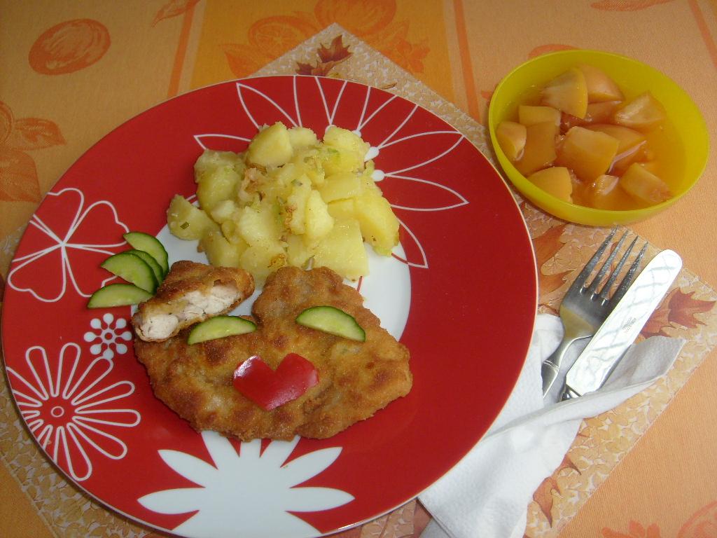 kuracie rezne zo stehna, zemiaky s cibuľkou, broskyňový kompót