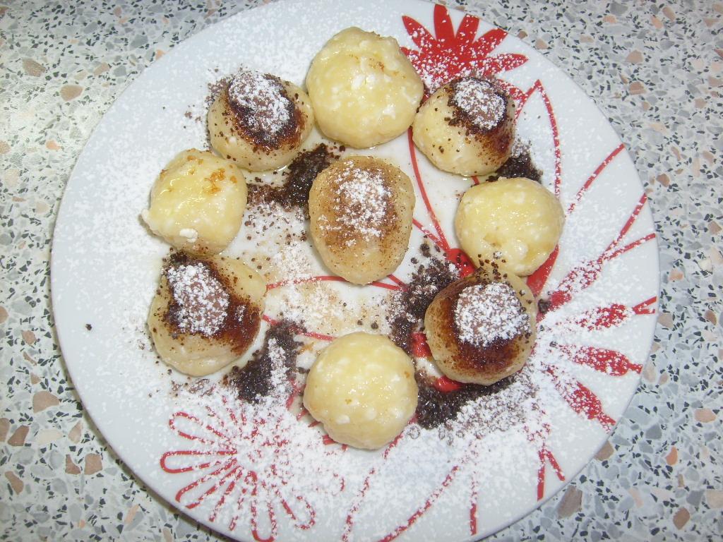 Tvarohové guľky - 1 tvaroh 250g, 13-15dkg krupice (podľa veľkosti vajca), 1 vajce, štipka soli, 0,25dcl oleja. Všetko spolu v mise rukou zmiesiť na vláčnu hmotu a robiť guľky veľkosti vlašského orecha. Uvariť v osolenej vode kým nevyplávajú na povrch