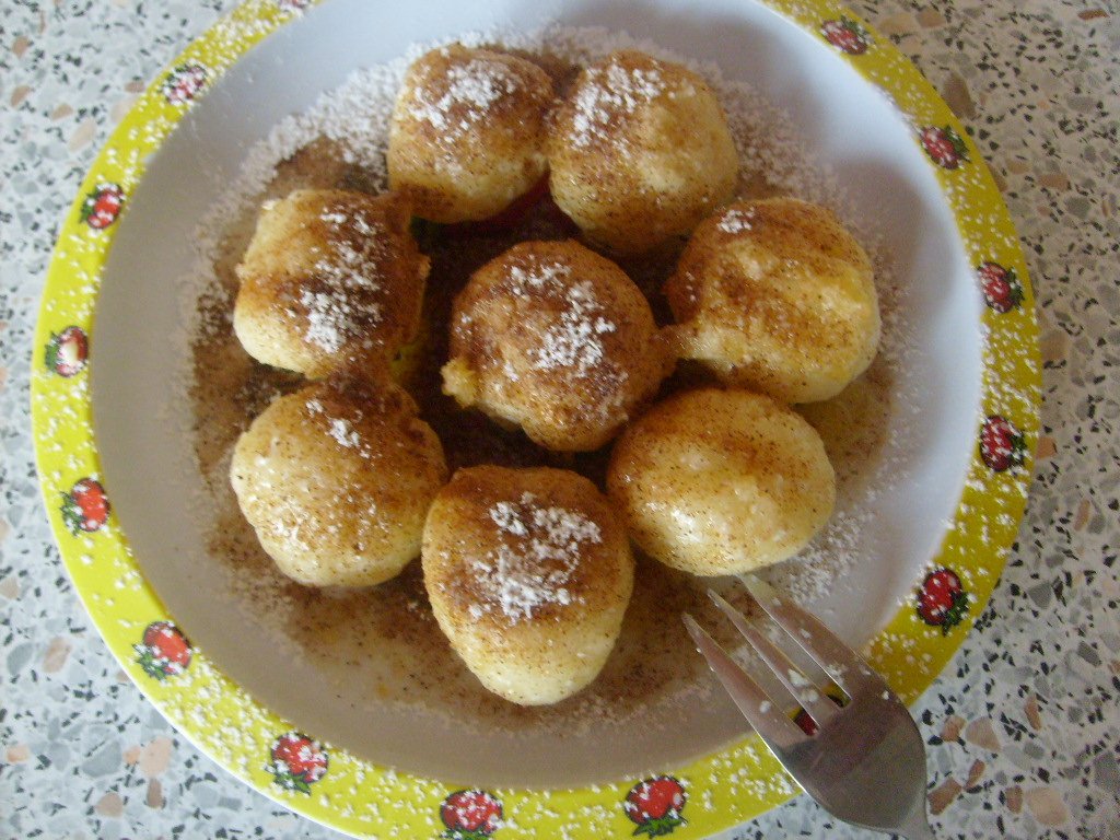 recept : 1 hrudkovitý tvaroh (250g), 1 vajce, 13-15dkg krupice, 0,25 dcl oleja, štipku soli. Všetko spolu rukou zhnetieme a robíme guľky veľkosti orecha - z dávky vyjde cca 30ks. Uvaríme v osolenej vode, kým nevyplávajú na povrch. Hotové polejeme rozpusteným maslom, posypeme práškovým cukrom alebo grankom, podľa chuti.