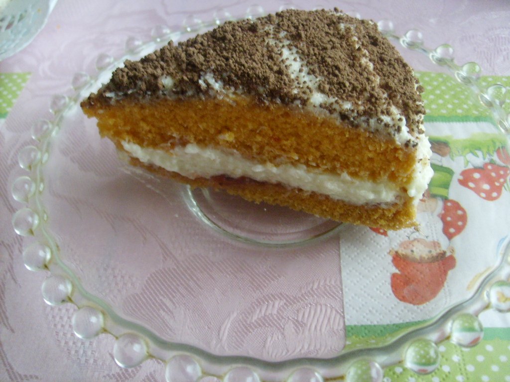 recept : piškóta so okrúhlej formy : 3vajcia, 15dkg kryštálového cukru spolu šľaháme na hustú penu, pridáme 15dkg hladkej múky, 1/2 prášku do pečiva, 0,75 dcl oleja, 0,75dcl vody, potravinárske farbivo (nemusí byť) ja som dala oranžové. Pečieme vo forme vystlanej papierom na pečenie na 180 cca 20-25 minút. Hotovú prekrojíme, namastíme lekvárom, plnkou a celú ju ešte potrieme plnkou, Posypeme grankom. plnka - 25dkg masla, 12dkg kokosu, 500ml mlieka, 80g práškového cukru, 1 vanilka, 1 kokosový puding (37g) - JA SOM ROBILA Z POLOVIČNEJ DÁVKY ! Kokos varíme s 250ml mlieka, kým sa všetka tekutina neodparí. Z pudingu, cukru a 250ml mlieka uvaríme puding, do ktorého za horúca vmiešame 50g masla a necháme ho vychladnúť. Zvyšné maslo vyšľaháme s vanilkou a cukrom podľa chuti a spojíme ho s pudingom aj kokosovou zmesou.