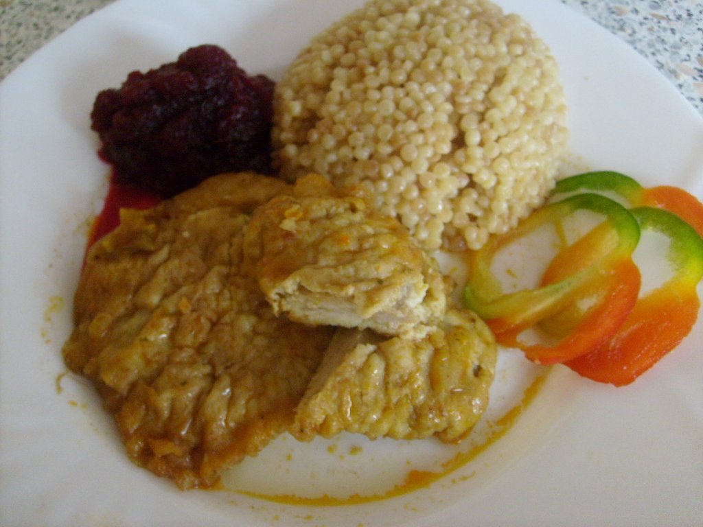 autor@mamulienka123 bravčové plátky naklepem, osolím,obalím v strúhanke, v rozšľahaných vajciach a opečiem na panvici na oleji. V kuchte (tlakovom hrnci) opražím cibuľu na oleji, pridám mletú červenú papriku,poukladám opečené mäsko, zalejem vodou, dochutím vegetou, korením a dusím do mäkka 45minút.