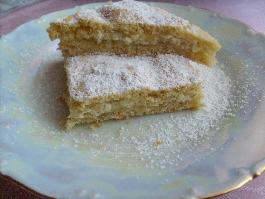 recept : 60dkg polohrubej múky, 15 dkg práškového cukru, 30dkg margarínu, 2 vajcia, 2dkg droždia, 1 ČL prášku do pečiva. Všetko spolu zhnetieme a rozdelíme na 2 časti. Plech vystlieme papierom alebo vymastíme margarínom a dáme jednu časť cesta, navrstvíme plnku a prikryjeme druhou časťou cesta. Povrch popicháme vidličkou. Pečieme na 180 asi 25-30 minút do ružova. Plnka - 300g tvarohu, 1 žĺtok, štipku soli, škoricový cukor, práškový cukor podľa chuti
