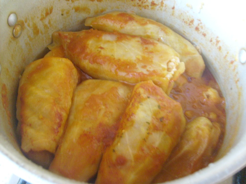 Ja robím z bravčového mäsa (pliecko alebo krkovička) 800g, zomeliem ho na mlynčeku s väčšími dierkami + 1 väčšiu cibuľu + 5 strúčkov cesnaku. Pridám 2 vajcia, 2 PL vegety, čierne korenie podľa chuti, 1 ČL mletej červenej papriky sladkej, 400g prepláchnutej surovej guľatej ryže, 1 malý paradajkový pretlak a 1 cibuľu nadrobno nakrájanú popraženú na oleji. Všetko spolu rukou zmiešam a v prípade potreby ešte dochutím. Vo veľkom hrnci varím hlávku zelenej kapusty v osolenej vode pričom si kapustu narežem v mieste hlúbu na 3 časti (do trojuholníka) aby sa jednotlivé listy dali odoberať. Počas varenia listy odoberám na misu a keď je potrebné ešte ich nechám potom znova už také podelené ešte chvíľu povariť do polomäkka. Záleží od kapusty či je zimná alebo letná, tú stačí kratšie obvárať. Z uvareného kapustného listu jemne zrežem hrubší hlúb a plním zmesou mäsa a ryže. Naukladám do hnca tesne vedľa seba a zalejem vodou v ktorej sa varila kapusta zmiešanou s paradajkovým pretlakom, používam 500g paradajkového pyré v krabičke, ochutnám a prípadne dosolím. Malo by byť zaliate až po vrch. Varím cca 40 minút.