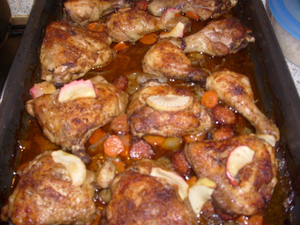 pečené stehná so slaninkou, cibuľou, klobáskou a jablkami