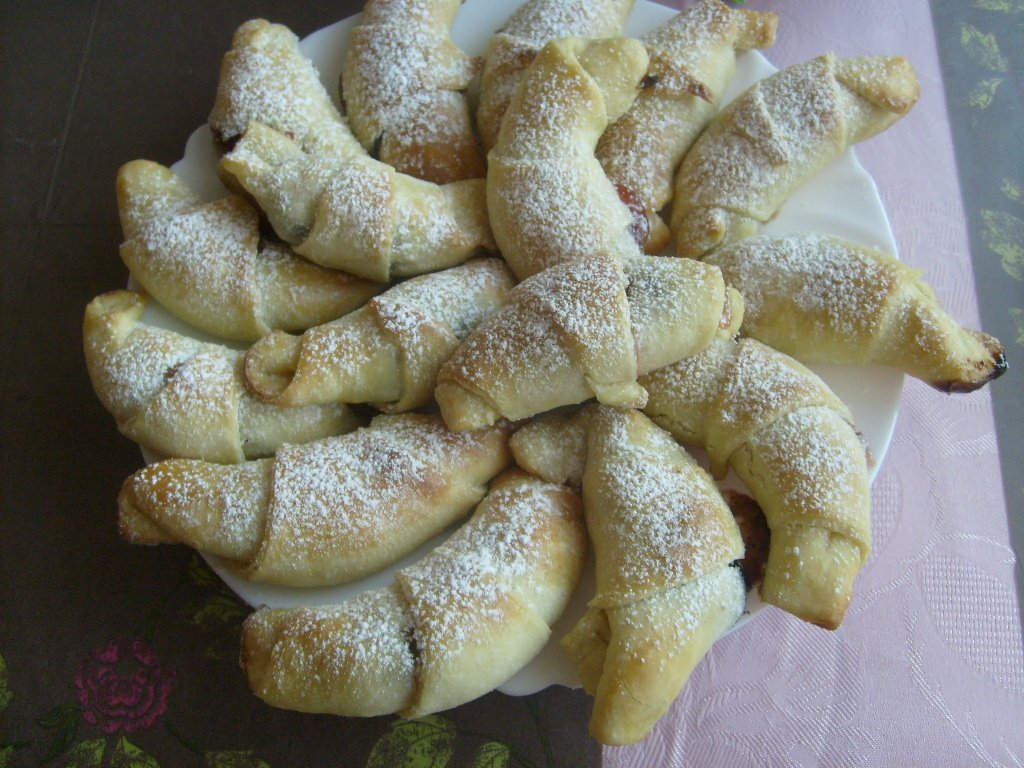 postup : v mlieku rozmiešame droždie (netreba nechať nakysnúť) pridáme cukor, soľ, prášok do pečiva. Vlejeme to do misy s múkou + olej + 2 žĺtka a rukou vypracujeme cesto. Urobíme valec a rozdelíme ho na 4 časti. Každú časť rozvaľkáme do kruhu a pokrájame na trojuholníky (8ks) Na širšiu časť trojuholníka dáme tvarohovú plnku a stočíme do tvaru rožka. Dáme na plech pokrytý papierom na pečenie ďalej od seba -narastú, potrieme rozšľahaným bielkom a necháme 45 minút podkysnúť. Potom pečieme v horúcej rúre na 200 krátko asi 8-10 minút. Hotové pocukrujeme.