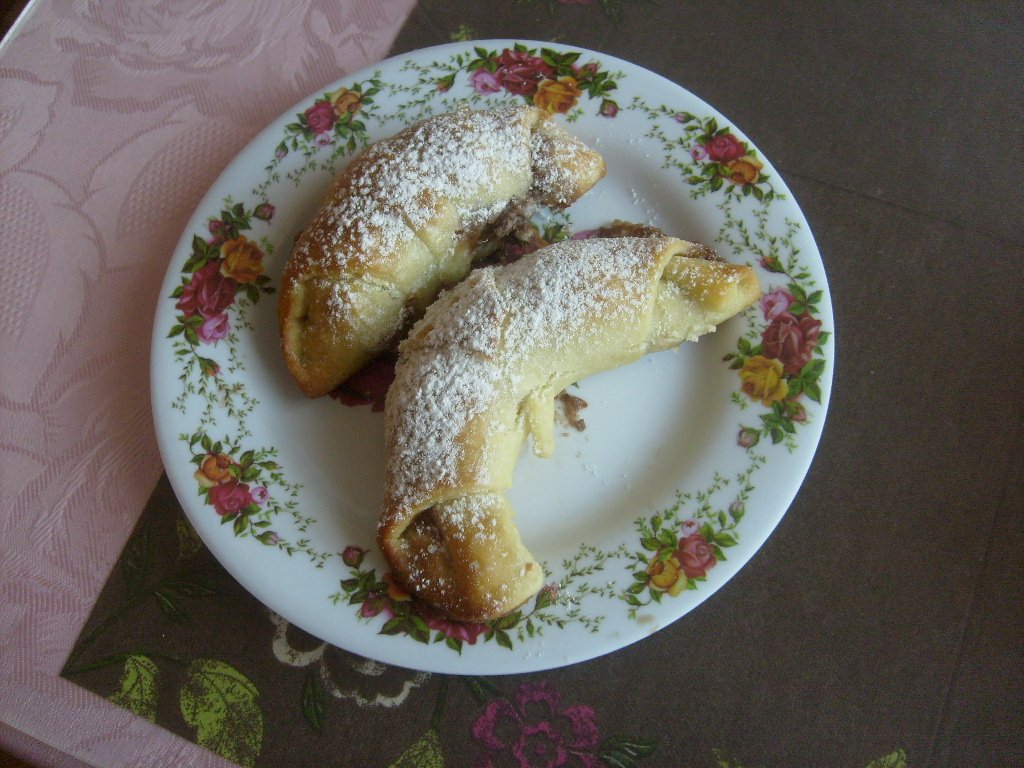 postup : v mlieku rozmiešame droždie (netreba nechať nakysnúť) pridáme cukor, soľ, prášok do pečiva. Vlejeme to do misy s múkou + olej + 2 žĺtka a rukou vypracujeme cesto. Urobíme valec a rozdelíme ho na 4 časti. Každú časť rozvaľkáme do kruhu a pokrájame na trojuholníky (8ks) Na širšiu časť trojuholníka dáme tvarohovú plnku a stočíme do tvaru rožka. Dáme na plech pokrytý papierom na pečenie ďalej od seba -narastú, potrieme rozšľahaným bielkom a necháme 45 minút podkysnúť. Potom pečieme v horúcej rúre na 200 krátko asi 8-10 minút. Hotové pocukrujeme.