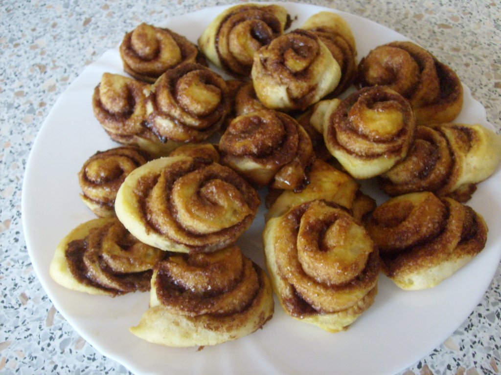 autor@popipolo klasické kysnuté cesto : 1/2 kocky čerstvé droždie,2KL kryštálový cukor, 1,5 dcl voda - urobíme kvások, pridáme 500g hladká múka, 2,5dlc teplého mlieka, 1KL soli , trochu oleja a poriadne premiesime, po pol/trištvrte hodine vykysnuté cesto rozdelíme na 2 polovice, každú rozvaľkáme, pokvapkáme roztopeným margarínom, posypeme väčším množstvom mletej škorice + kryštálový cukor+vanilka (môžme si rozmiešať v miske), znova pokvapkáme roztopeným margarínom a natesno zrolujeme. Pokrájame ostrým nožom na 1,5 cm kúsky a dáme na plech vystlaný papierom na pečenie ,pečieme na 200 asi 25min.