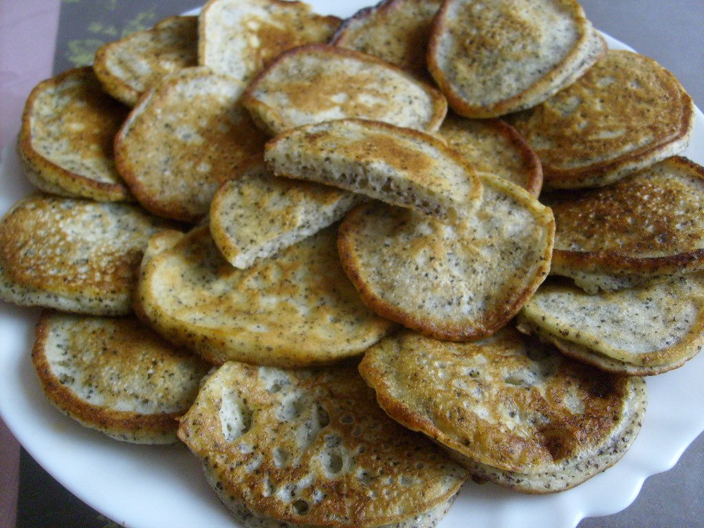 autor@ibulienka 1kyslá pochúťková smotana, 1 vajce, hladká múka, mlieko, 1malá lyžička sody bicarbony, štipka soli, 1KL cukru, 3-4 PL mletého maku. Múka a mlieko od oka, tak aby vzniklo polotuhú cesto - malo by sa pomaly liať z lyžice. Robím v tenkej vrstve na malom ohni, aby sa dobre prepiekli a neboli vo vnútri surové.