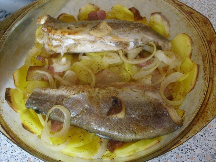 pečený pstruh so zemiakmi, cibuľkou, slaninkou
