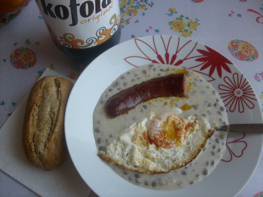 šošovicový prívarok, volské oko, pečená klobáska, bagetka, chladená kofola