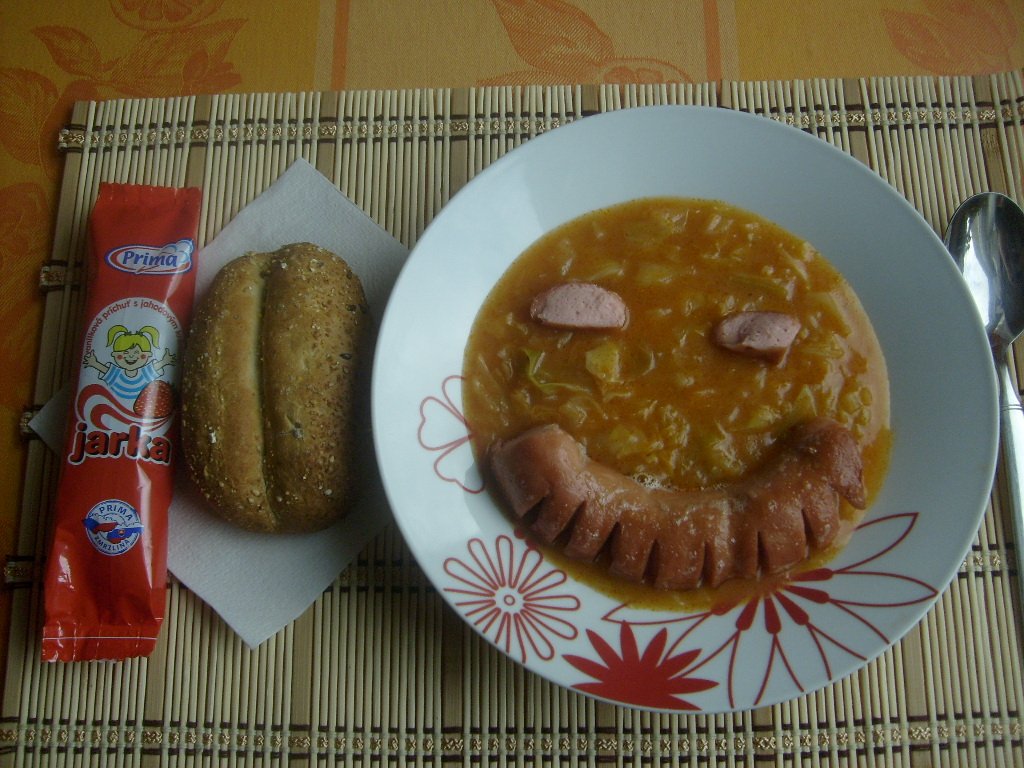 Paradajková kapusta-prívarok + pečená klobáska, dezert - nanuk