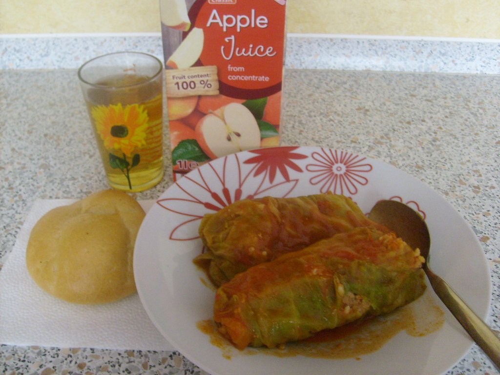 ecept - mleté bravčové mäso 750g, cibuľa nadrobno pokrájaná, 3-5strúčikov pretlačeného cesnaku, 1 cibuľa nadrobno pokrájaná popražená na oleji, umytá surová ryža 500g, soľ, mleté čierne korenie, vegeta, 2vajcia, malý-stredný pretlak paradajkový. Všetko spolu zmiešať a plniť vopred obvarené kapustné listy v osolenej vode. Na spodok hrnca dám pár listov, poukladám holubky, zalejem vodou, v ktorej sa obárali kapustné listy zmiešanou s pretlakom a soľou a varím do mäkka cca 35minút.