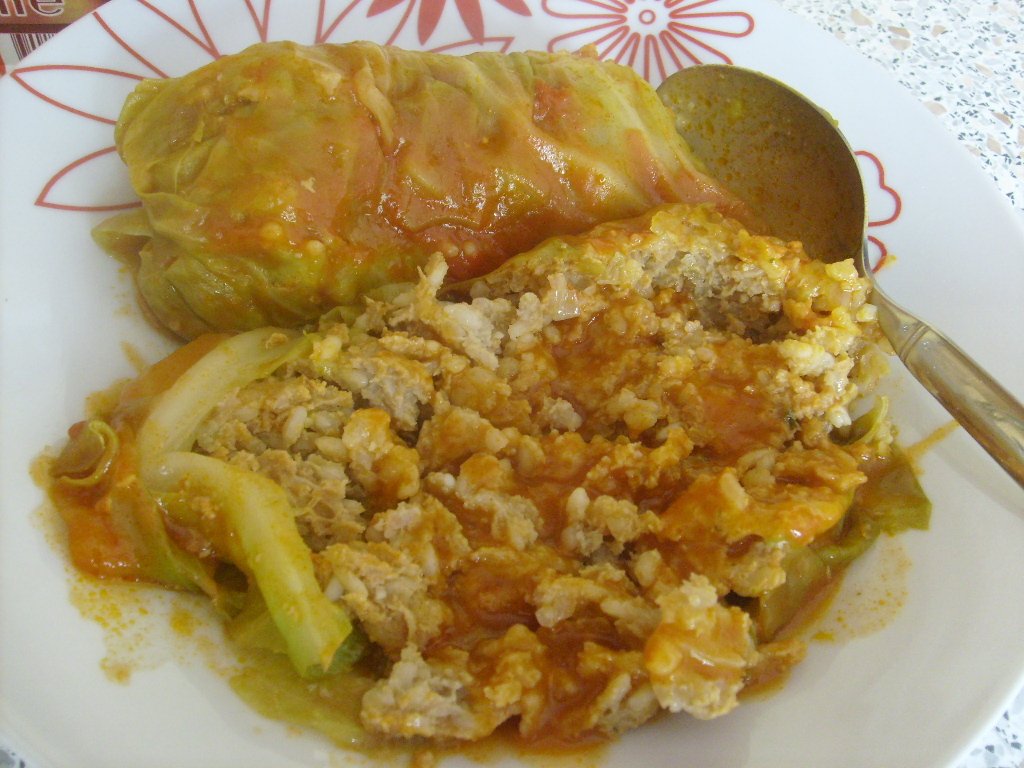 Ja robím z bravčového mäsa (pliecko alebo krkovička) 800g, zomeliem ho na mlynčeku s väčšími dierkami + 1 väčšiu cibuľu + 5 strúčkov cesnaku. Pridám 2 vajcia, 2 PL vegety, čierne korenie podľa chuti, 1 ČL mletej červenej papriky sladkej, 400g prepláchnutej surovej guľatej ryže, 1 malý paradajkový pretlak a 1 cibuľu nadrobno nakrájanú popraženú na oleji. Všetko spolu rukou zmiešam a v prípade potreby ešte dochutím. Vo veľkom hrnci varím hlávku zelenej kapusty v osolenej vode pričom si kapustu narežem v mieste hlúbu na 3 časti (do trojuholníka) aby sa jednotlivé listy dali odoberať. Počas varenia listy odoberám na misu a keď je potrebné ešte ich nechám potom znova už také podelené ešte chvíľu povariť do polomäkka. Záleží od kapusty či je zimná alebo letná, tú stačí kratšie obvárať. Z uvareného kapustného listu jemne zrežem hrubší hlúb a plním zmesou mäsa a ryže. Naukladám do hnca tesne vedľa seba a zalejem vodou v ktorej sa varila kapusta zmiešanou s paradajkovým pretlakom, používam 500g paradajkového pyré v krabičke, ochutnám a prípadne dosolím. Malo by byť zaliate až po vrch. Varím cca 40 minút.