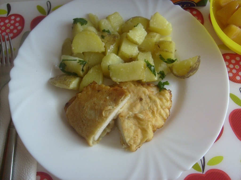 kuracie rezne v cestíčku, nové zemiaky, broskyňový kompót