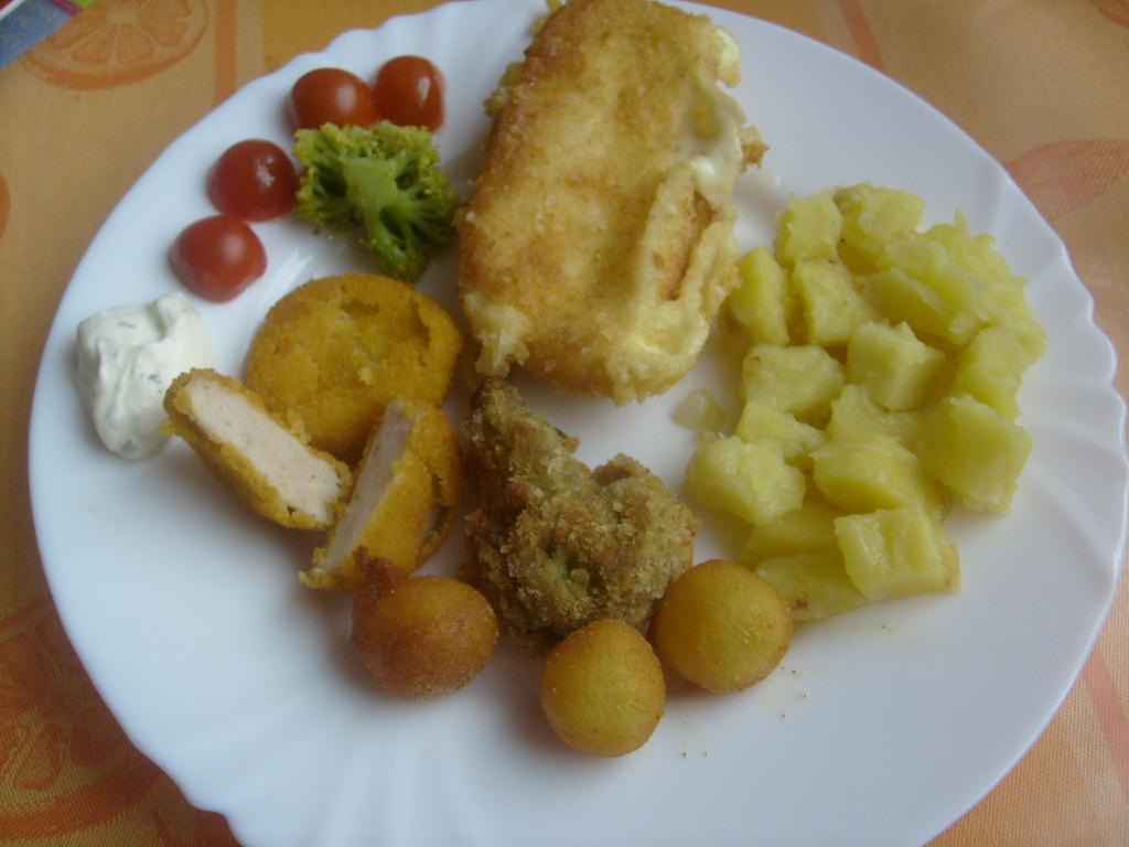 Vyprážaný syr, vyprážané kuracie nugetky, vyprážaná brokolica, zemiaky, krokety