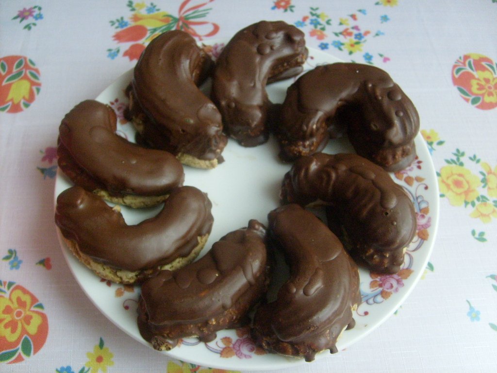 recept cesto : 24dkg mletých orechov, 24dkg práškového cukru, 3 dkg strúhanky, 2 vajcia - všetko spolu rukou zmiešať a na papierom vystlaný plech dávať urobené rožky.( Na tanier som si posypala trochu práškového cukru, odobrala väčšiu ČL cesta a ušúľala rožok.) Pečieme na 150 asi 15minút. recept plnka : nad parou varíme vyšľahané 3 vajcia s 15dkg kryštálovým cukrom + 3PL kakaa a 2PL polohrubej múky. Uvaríme hustú plnku. Vycladnutú ju zmiešame s 250g masla. Plnku striekame na vychladnuté rožky pomocou sáčka, necháme v chladničke dobre stuhnúť a polejeme čokoládovou polevou.