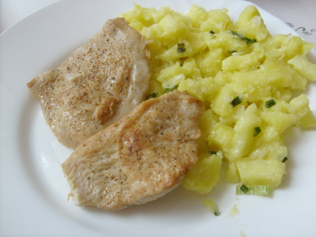 Morčací rezeň na prírodno, zemiaky s cibuľkou
