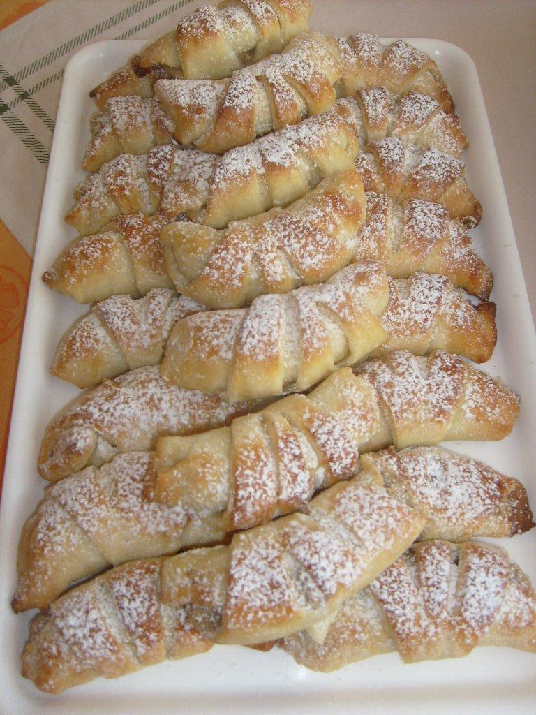 postup : v mlieku rozmiešame droždie (netreba nechať nakysnúť) pridáme cukor, soľ, prášok do pečiva. Vlejeme to do misy s múkou + olej + 2 žĺtka a rukou vypracujeme cesto. Urobíme valec a rozdelíme ho na 4 časti. Každú časť rozvaľkáme do kruhu a pokrájame na trojuholníky (8ks) Na širšiu časť trojuholníka dáme orechovú plnku a stočíme do tvaru rožka. Dáme na plech pokrytý papierom na pečenie ďalej od seba -narastú, potrieme rozšľahaným bielkom a necháme 45 minút podkysnúť. Potom pečieme v horúcej rúre na 200 krátko asi 8-10 minút. Hotové pocukrujeme.