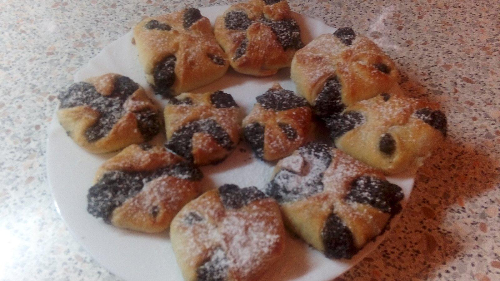 klasické kysnuté cesto : 1/2 kocky čerstvé droždie,2KL kryštálový cukor, voda - urobíme kvások, pridáme 500g hladká múka, 2,5dlc teplého mlieka, 1KL soli, trochu oleja a poriadne premiesime, po pol/3/4 hodine vykysnuté cesto rozvaľkáme, pokrájame na štvorce, plníme plnkou, preložíme na kríž. Dáme na plech s papierom na pečenie, potrieme rozšľahaným vajíčkom, pečieme na 200 asi 25min.