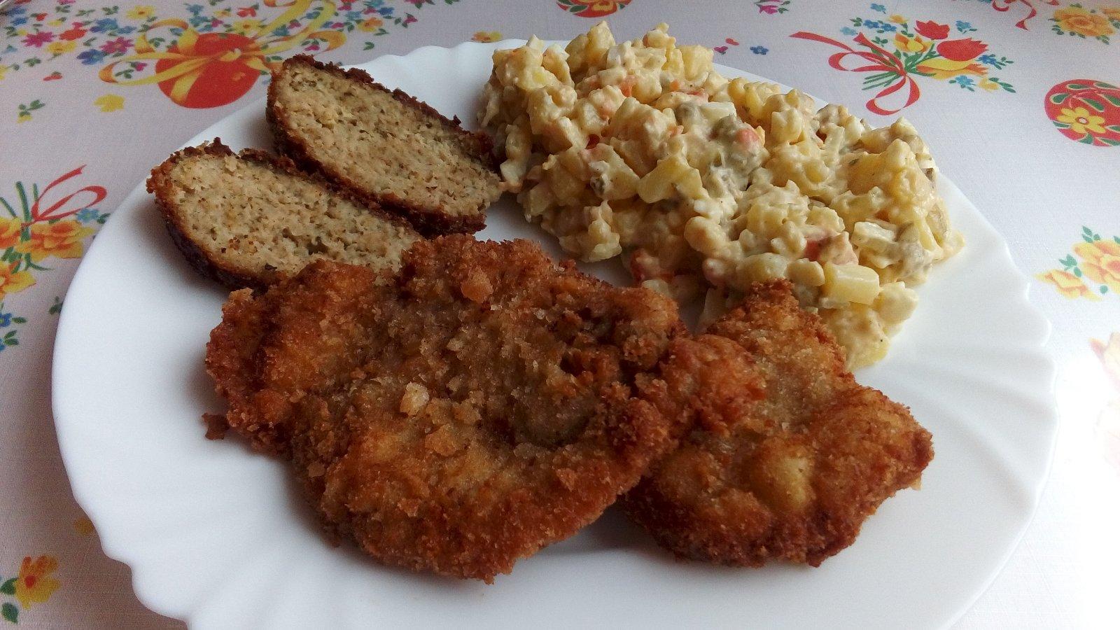 bravčový rezeň, fašírka, zemiakový šalát