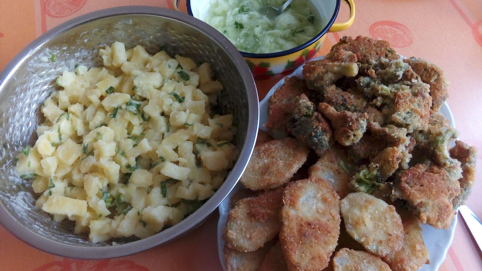 vyprážaný mladý kaleráb, brokolica, zemiaky, uhorkový šalát