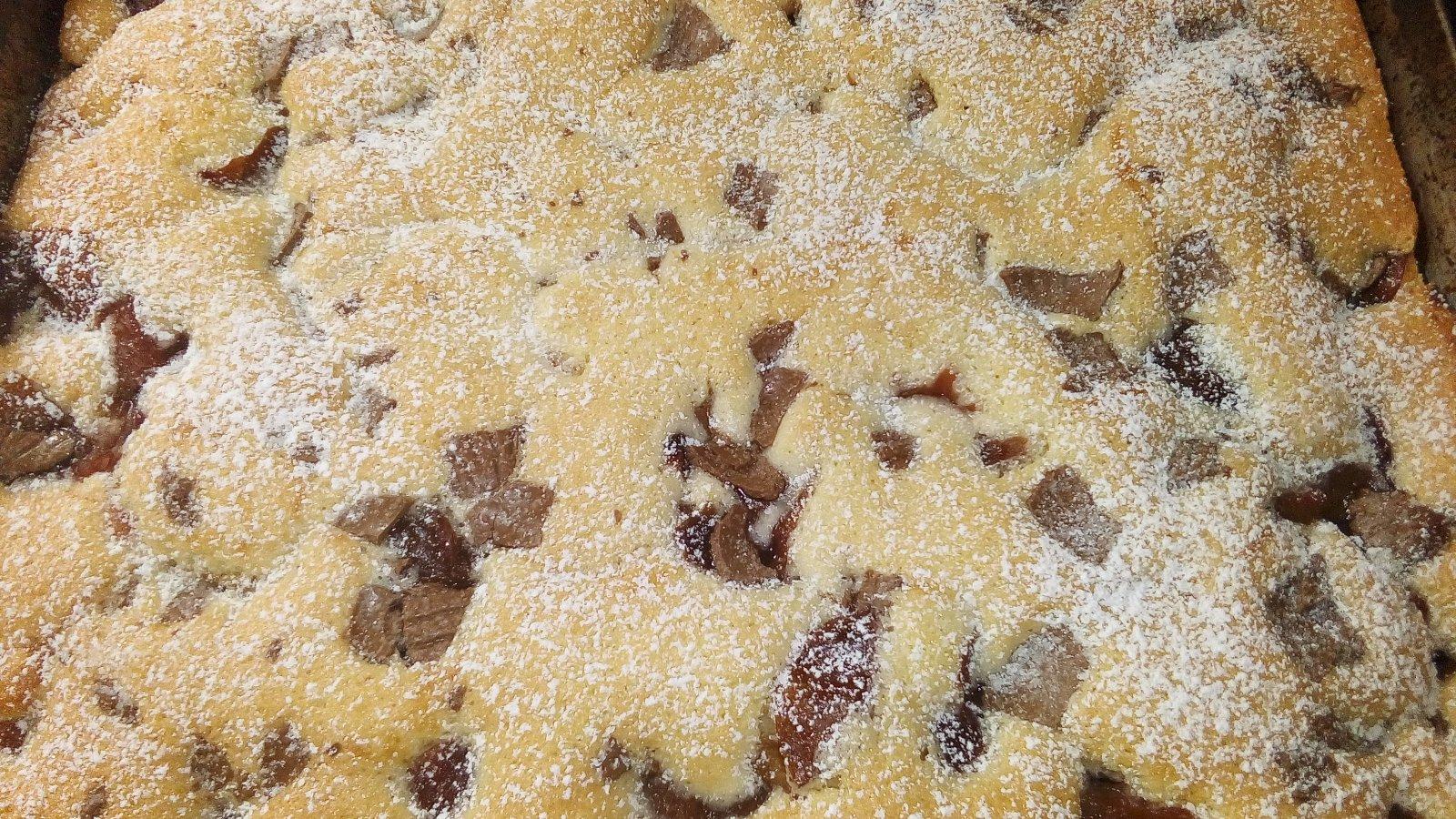 recept : 4 celé vajcia vyšľahať s 20dkg kryštálového cukru. Do hustej peny vmiešať 20dkg hladkej múky zmiešanej s 1 práškom do pečiva, vliať 100ml oleja, 100ml vody. Všetko spolu zmiešať, vyliať na plech, poukladať ovocie a pridala som aj kúsky mliečnej čokolády, piecť na 180 asi 20-25minút. Hotový pocukrovať.