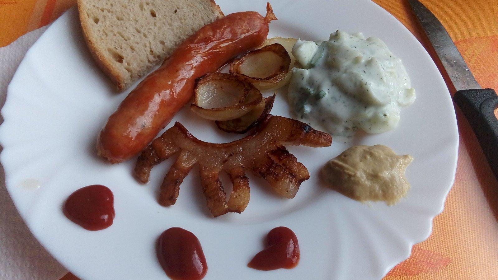 pečená klobáska, slanina, cibuľa