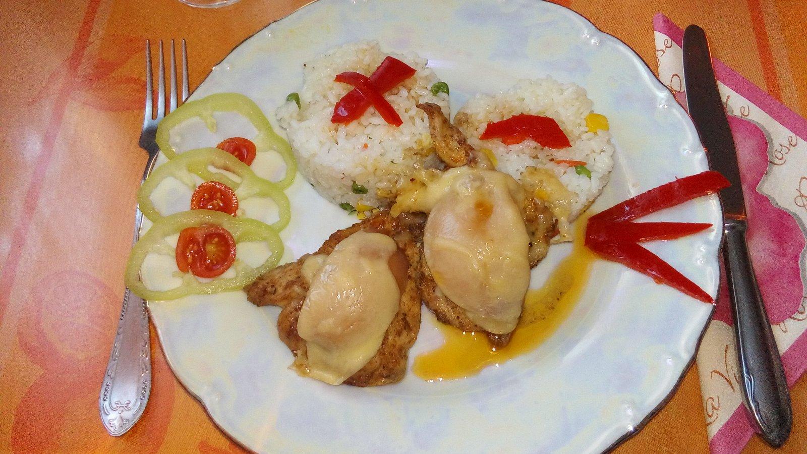 kuracie prsia s broskyňou a syrom, zeleninová ryža