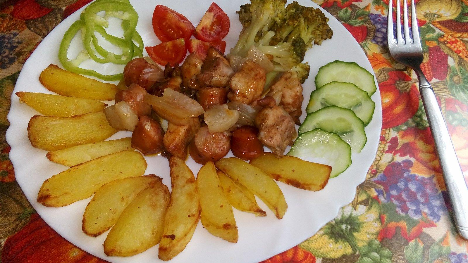 vykostené kurča na kúsky s 2 druhmi klobásky, slaninkou a cibuľou, opekané zemiaky, obloha :)