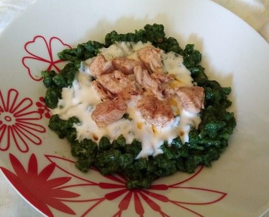 Špenátové halušky so syrovou omáčkou a kuracím mäskom