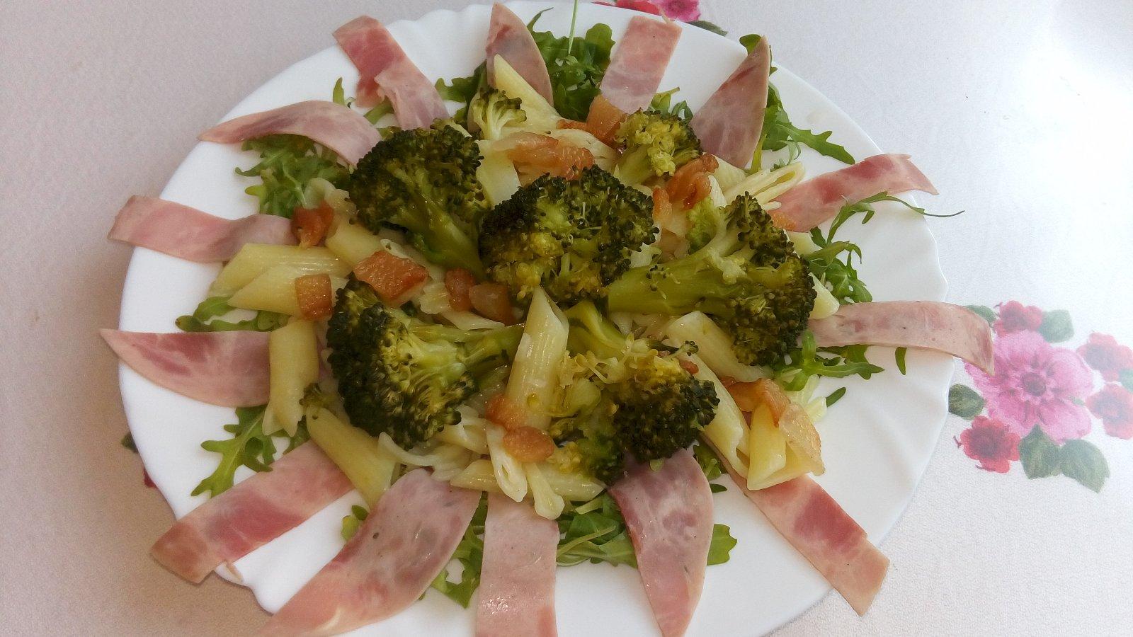 cestoviny so syrokrémom, šunkou, rukolou, brokolicou a popraženou slaninkou