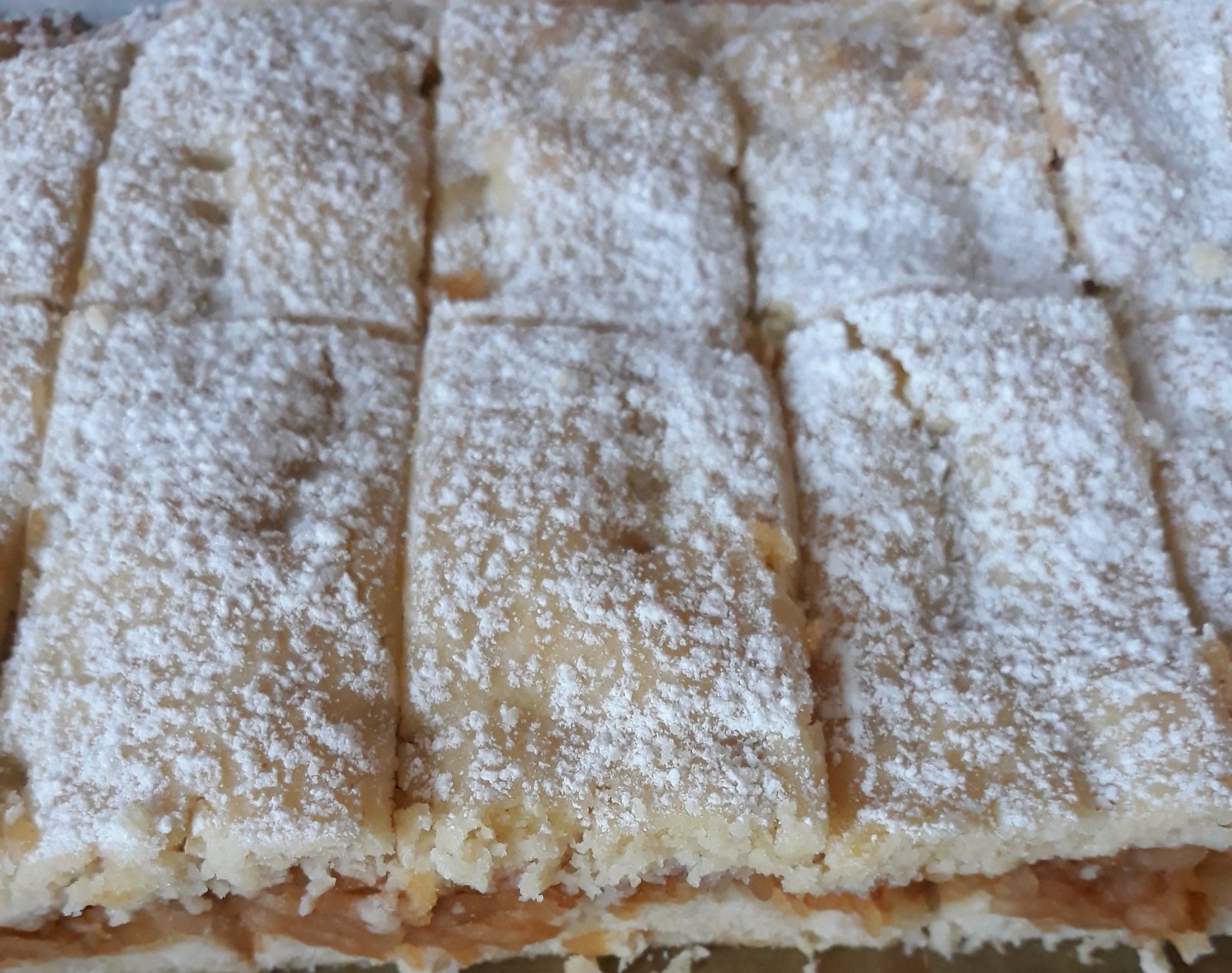 autor@kamilkak 600g polohrubej múky, 15 dkg práškového cukru, 30 dkg margarínu,2 vajcia, 2 dkg droždia, 1 ČL prášku do pečiva. Všetko spolu zhnetieme a rozdelíme na 2 časti. Plech vystelieme papierom na pečenie alebo vymastíme margarínom a dáme jednu časť rozvaľkaného cesta, navrstvíme jablká a prikryjeme druhou rozvaľkanou časťou, Povrch popicháme vidličkou. Pečieme na 180 asi 25-30 minút doružova. Hotové pocukrujeme práškovým cukrom. Plnka : 1 kg očistených nastrúhaných jablk ochutených škoricovým, vanilkovým a kryštálovým cukrom. Plnka môže byť aj tvarohová - hrudkovitý tvaroh 500g, 2 žltky, štipku soli, vanilkový cukor, kryštálový cukor podľa chuti.