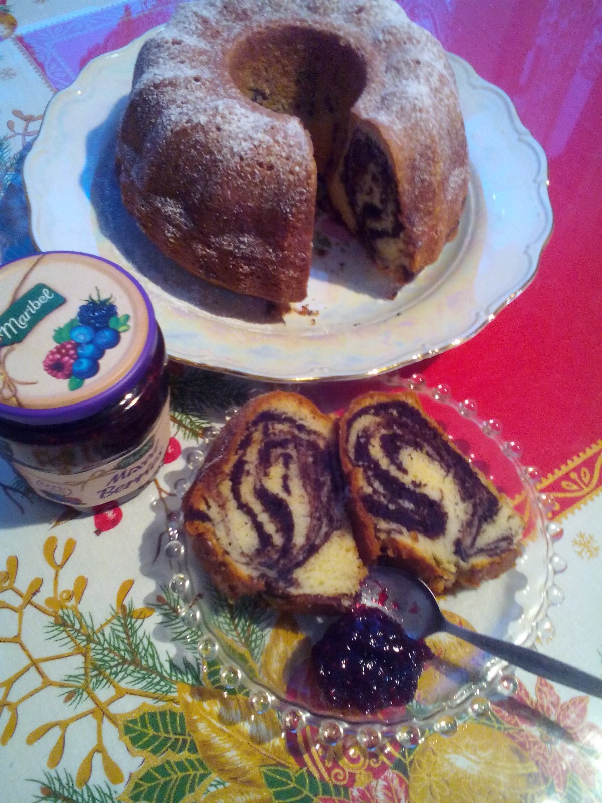 recept : 4 vajcia vyšľahať s 30 dkg práškového cukru na hustú penu, pridať 30 dkg hladkej múky + 1 prášok do pečiva, 2,2 dcl mlieka, 2 dcl oleja, všetko spolu zmiešať. Odobrať asi 1/3 a pridať do nej 2-3 PL kakaa + trochu mlieka, aby bola hustota oboch častí rovnaká (kakao zahustí). Hmotu lejeme striedavo do vymastenej a múkou vysypanej formy a nakoniec párkrát zakrúžime vidličkou vo forme aby vzniklo mramorovanie. Pečieme na 180 asi 45 minút.