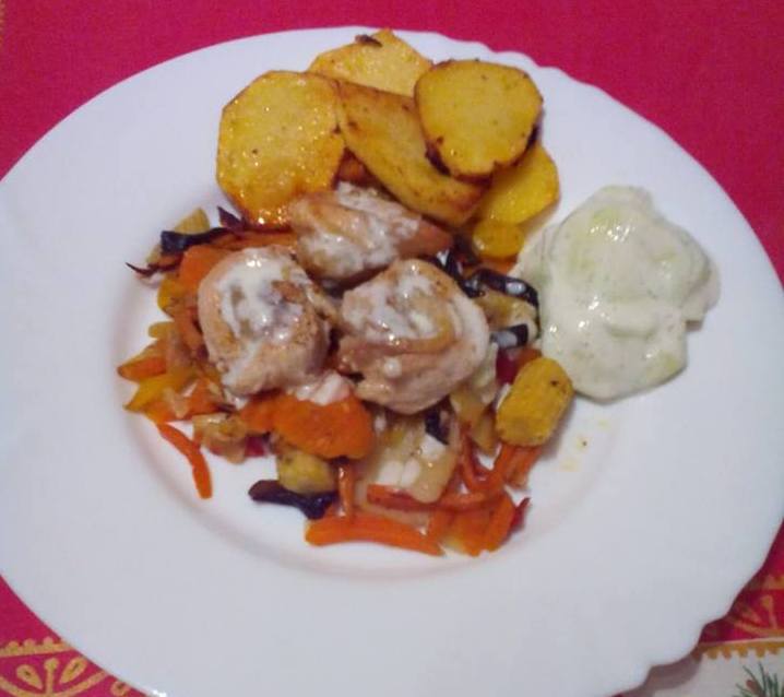 Závitky z kuracích pŕs a slaninky, opekané zemiakové čipsy, dusená zelenina, tzatziky