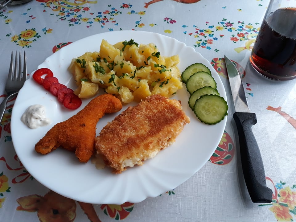 vyprážaný syr, kurací polotovar - zvieratko, zemiaky s vňaťkou