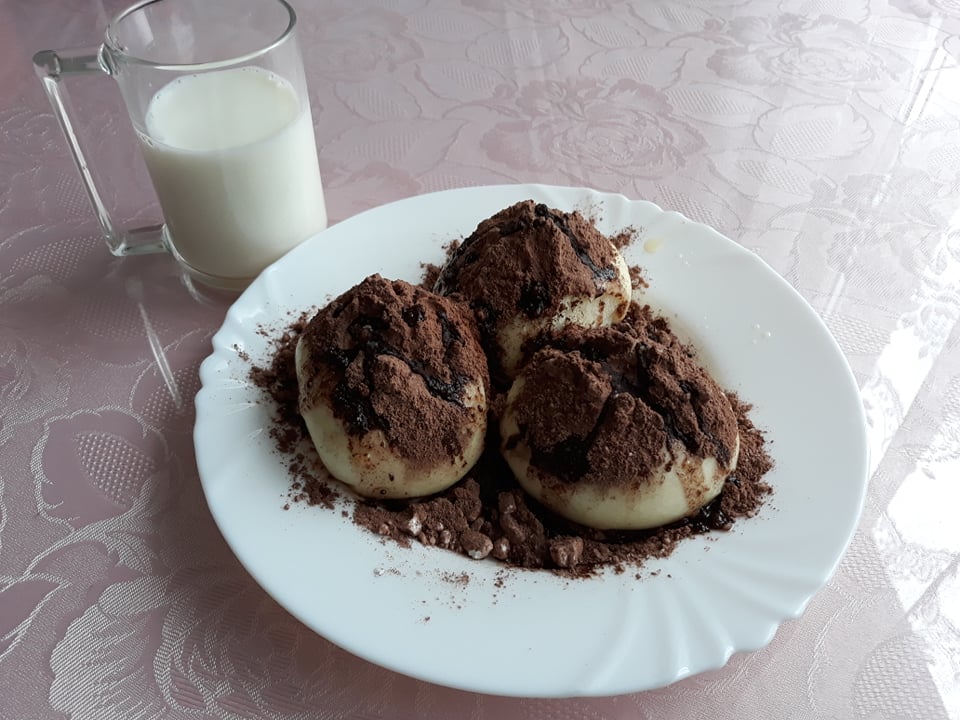 buchty plnené jahodovým lekvárom, s kakaom a maslom, mlieko