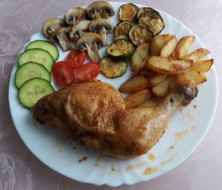 Pečené stehno, grilované šampiňóny a cuketa, zemiaky, obloha