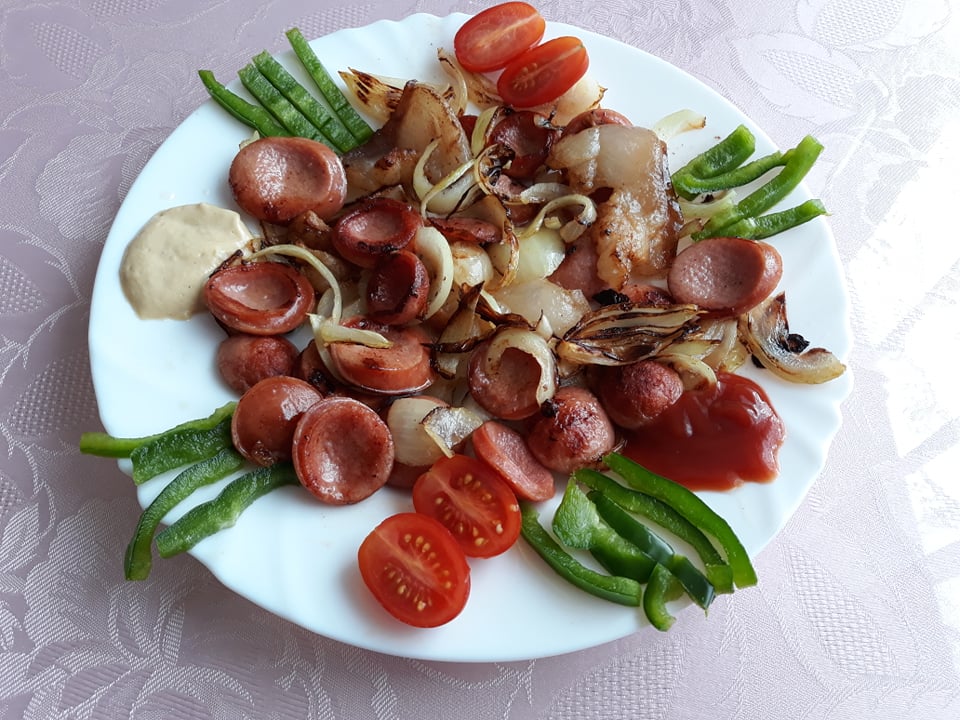 z jednej panvičky - pečená slanina, klobáska, zeleninka